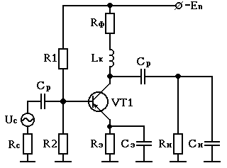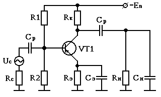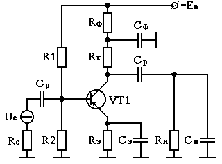 Схема резисторного усилителя переменного тока на биполярном транзисторе по схеме с общим эмиттером представлена на рис. 3.2, где Rc - внутреннее сопротивление источника сигнала Uc ; R1 и R2 - сопротивления делителя, задающие рабочую точку транзистора VT1 ; Rэ - сопротивление в цепи эмиттера, которое шунтируется конденсатором Сэ ; Rк - коллекторное сопротивление; Rн - сопротивление нагрузки; Cp - разделительные конденсаторы, обеспечивающие разделение по постоянному току транзистора VT1 от цепи сигнала и цепи нагрузки.