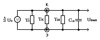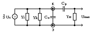 Эквивалентная схема выходной цепи усилителя по схеме рис.3.2 представлена на рис. 3.3, где: S - крутизна трагзистора, Uc - входной сигнал, Yi = Y22 - выходная проводимость транзистора, Yк =1/Rк - коллекторная проводимость , Со = Свых + См + Сн , Свых - выходная емкость транзистора, См - распределенная паразитная и монтажная емкости, Сн - емкость нагрузки, Ср - разделительный конденсатор, Yн = 1/Rн - проводимость нагрузки. Отметим, что обычно в усилителях проводимости Yi < Yн <Yк (1/Yi > Rн > Rк).