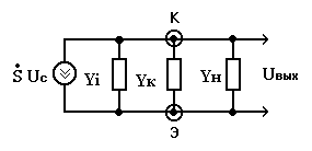 Эквивалентная схема получена с учетом того, что на переменном токе шина питания (“-Еп ”) и общая точка (“земля”) являются короткозамкнутыми, а также с учетом допущения 1/ w C э << R э , когда можно считать эмиттер VT 1 подключенным на переменном токе к общей точке.