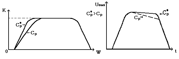 Ч ем ниже частота сигнала w , тем больше емкостное сопротивление Ср (1/ w C р ), и тем меньшая часть напряжения попадает на выход, в результате чего происходит снижение усиления. Таким образом, Ср определяет поведение АЧХ усилителя в области НЧ и практически не оказывает влияния на АЧХ усилителя в области средних и высоких частот. Чем больше Ср , тем менбше искажения АЧХ в области НЧ, а при усилении импульсных сигналов - тем меньше искажения импульса в области больших времен (спад плоской части вершины импульса), как показано на рис.3.6.