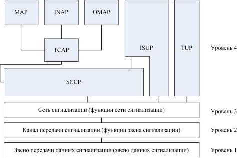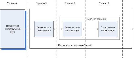 -Уровень 4 (функции подсистемы пользователя) состоит из различных подсистем пользователей, каждая из которых определяет функции и процедуры сигнализации, характерные для определенного типа пользователя системы. Набор функций подсистемы пользователя может значительно различаться для разных категорий пользователей системы сигнализации. В общем виде можно выделить две группы пользователей:
