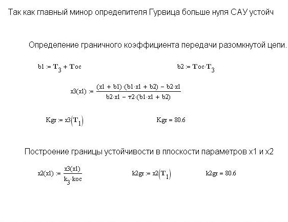 3) По критерию устойчивости Гурвица определить устойчивость САУ, рассчитать граничное значение коэффициента передачи разомкнутой цепи и построить область устойчивости САУ относительно варьируемых параметров
