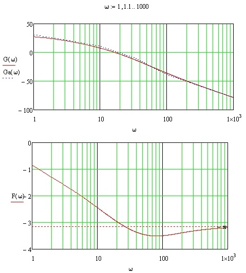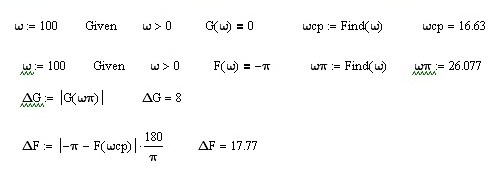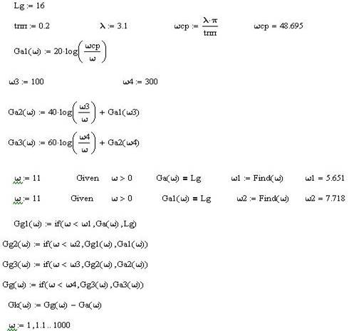 Асимптотическая ЛАЧХ разомкнутой цепи САУ строится путем суммирования асимптотических ЛАЧХ ее звеньев. Общая формула для расчета асимптотической ЛАЧХ инерционного, форсирующего и колебательного звеньев в пакете MathCad осуществляется с помощью условного оператора if и имеет вид