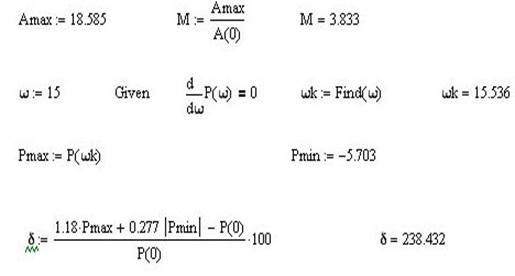 В рассчитанном варианте показатели качества регулирования хуже, чем заданные. Достижения заданного уровня показателей качества можно достигнуть путем увеличения частот ω3 и ω4 . Например, при ω3 =230 и ω4 =390 удается получить значения δ=24,95 и t пп =0,198.