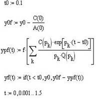 Реализация данного пункта задания курсовой работы в пакете MathCad приведена ниже. Здесь корни характеристического полинома находятся путем трехкратного применения функции root при различных приближениях. Затем из корней формируется вектор p и используется приведенная формула разложения в ее векторном варианте.