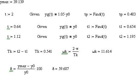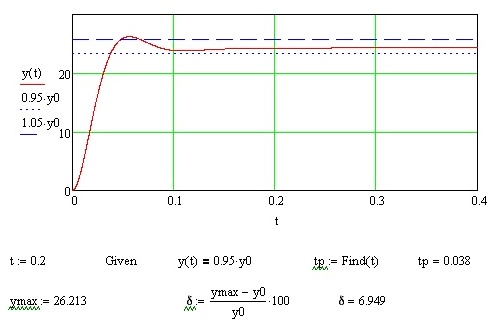 Показатели качества переходных процессов находятся непосредственно из рассчитанных характеристик; перерегулирование рассчитывается, исходя из максимального y max и установившегося y 0 значений выходной переменной, а время переходного процесса – путем решения уравнений y ( t ) =0,95· y 0 или y ( t ) =1,05· y 0 .