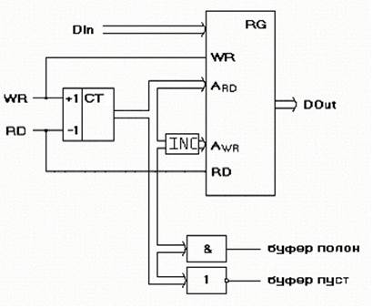 Чтение из памяти осуществляется аналогичным методом. Сигнал чтения из памяти поступает в блок управления, по его приходу в блоке формирования адреса формируется адрес чтения. Сформированный адрес поступает на вход блока дешифрации адреса. Далее по линии определяемой поступившим адресом посылается сигнал соответствующему регистру в блоке регистров о том, что регистру пора выдать данные на шину чтения. Данные считываются из регистра. Если при этом адрес записи становится равным нулю, то выдается сигнал о том, что буфер пуст.