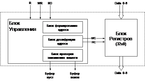 Блок регистров представляет собой набор из 32-х восьмиразрядных регистров с параллельным вводом и выводом информации. Регистры имеют Z-состояние. Входные данные поступают в блок регистров по 8-разрядной шине. С выхода блока дешифрирования адреса на регистры поступают сигналы разрешения записи и чтения. Сигнал разрешения записи WC является для регистра стробирующим, по нему регистр считывает данные с шины записи. По сигналу чтения RC регистр выходит из Z-состояния и подключается к шине чтения, данные становятся доступными для чтения.