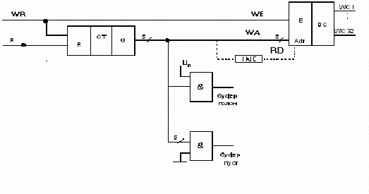 Данный блок предназначен для выявления ситуаций обнуления и переполнения памяти. Если счетчик обнулен то буфер пуст, а если наоборот все разряды счетчика единицы то «буфер полон».Смысл этих сигналов понятен из их названия.