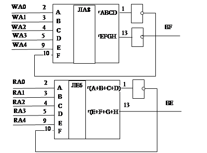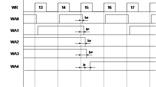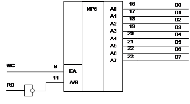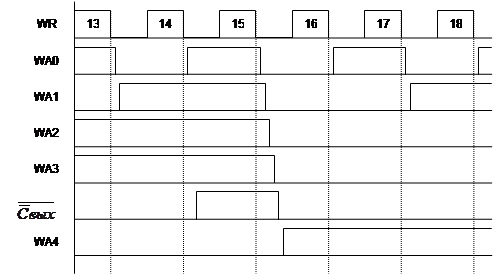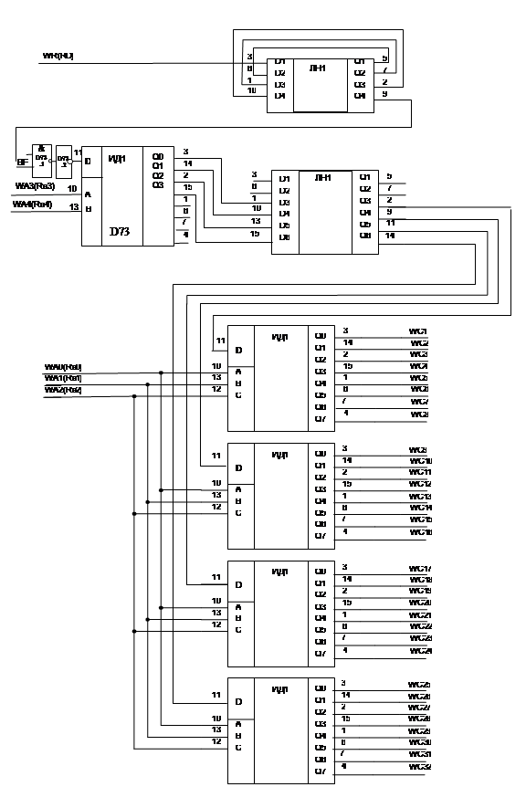 Следует заметить, что вначале приходит адрес WA0, за ним через некоторое время WA1, затем WA2, затемWA3 и последним приходит сигнал WA4, в связи с этим необходима задержка для сигнала WR/ до тех пор пока не придет последний адресный сигнал. В качестве элементов задержки используются микросхема К561ЛН1 – это логические элементы 2ИЛИ-НЕ. Данные элементы реализуют задержку сигнала чтения или записи, необходимую для корректной работы дешифратора. Так как активный уровень, разрешающий работу дешифратора, низкий то 2-ая микросхема К561ЛН1 – для инвертирования сигналов.