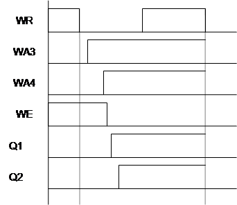 WE/ – это сигнал WR/ после прохождения через цепочку инверторов, Q1-выход с дешифратора номера элемента (дешифратора), Q2-выход с дешифраторов адреса.