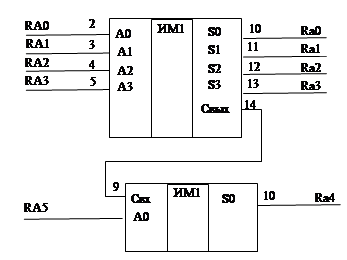 Далее представлена схема реализации дешифратора на 25 =32 адресов при помощи каскада дешифраторов К561ИД1.