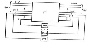 Функциональный узел А устройства в общем виде может быть представлен конечным автоматом, содержащим однотактный логический преобразователь ЛП с f входами, w выходами и z обратными связями, в каждой из которых размещен двухпозиционный элемент памяти ЭП (рис. 1.1). Контрольное устройство тоже может быть представлено в виде некоторого конечного автомата В.