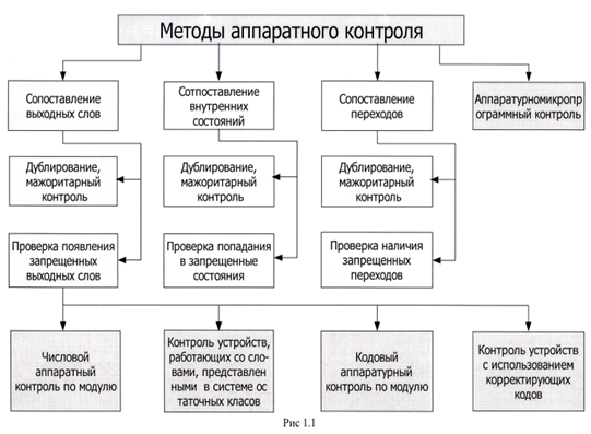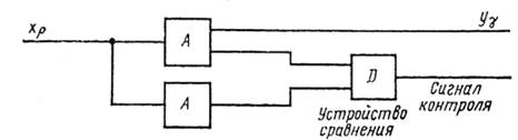 При аппаратурном контроле в состав узла или устройства вводится избыточная (контрольная) аппаратура, которая функционирует одновременно с основной аппаратурой. Сигналы, возникающие в процессе функционирования основной и контрольной аппаратуры, по определенным законам сопоставляются между собой. В результате этого сопоставления вырабатывается информация о правильности функционирования контролируемого узла (устройства).