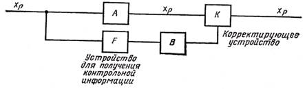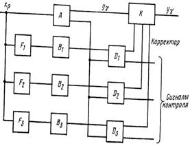 При передаче и хранении информации применяется также контроль с использованием корректирующих кодов (коды Хэмминга, циклические коды и т. д.). Автомат А в этом случае информацию не перерабатывает. Следовательно, процесс контроля сводится здесь к формированию специальных контрольных слов на входе автомата В и проверке соответствия выходных слов автоматов А и В. Контрольные соотношения, возникающие в результате применения корректирующих кодов, позволяют не только обнаруживать искажения информации, но и исправлять возникшие ошибки. Для этой цели используется корректор. Структурная схема узла (устройства), контролируемого с использованием корректирующих кодов, представлена на рис. 1.7.