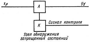 Применяют еще один способ контроля, использующий искусственно введенную в узлы и устройства аппаратурную избыточность , что приводит к возникновению большого количества таких состояний, которые при нормальной работе не используются (запрещенные). Структура устройства (узла) выбирается так, чтобы при появлении ошибок с большей вероятностью происходил переход в запрещенные состояния. Для определения факта попадания устройства в одно из запрещенных состояний должен быть предусмотрен отдельный узел (рис. 1.8). Аналогичную проверку можно осуществить как по запрещенным выходным словам, так и по запрещенным переходам.