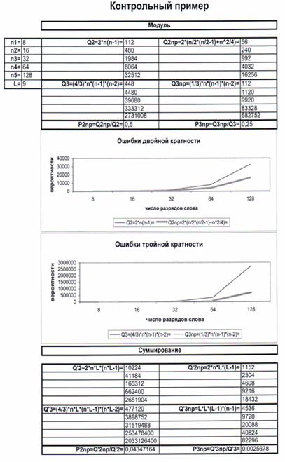 В приведенном контрольном примере рассматривались зависимости вероятностей появления ошибок двойной и тройной кратности от разрядности информационного слова. Как уже говорилось выше, применение одного вида контроля (суммирования или контроля по модулю) не является достаточно эффективным, т.к. каждый из методов имеет недостатки. Для достижения наибольшей вероятности обнаружения ошибок следует использовать комбинацию данных методов. В сочетании они дополняют друг друга: ошибки, не обнаруженные контролем по mod 3, будут обнаружены методом контрольного суммирования. С другой стороны, если двойные ошибки находятся в разных словах и не могут быть обнаружены методом контрольного суммирования, то они будут обнаружены методом контроля по mod 3.