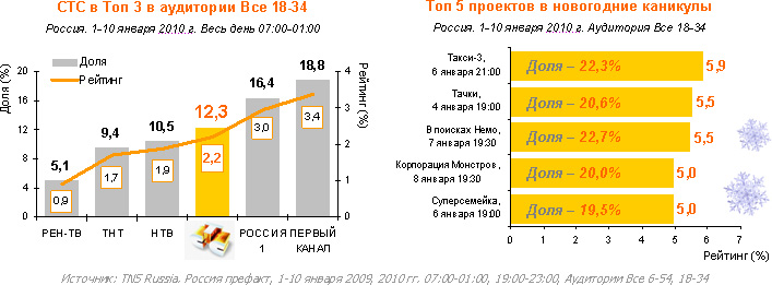 По итогам первых десяти дней января 2010 года в молодой, потребительски активной аудитории(18-34 лет) телеканал занял 3 место по среднесуточному телесмотрению с долей 12,3% и рейтингом 2,2%. В широкой аудитории 6-54 рейтинг достиг 2,7%, доля составила 12,0%. Показатели по обеим аудиториям более, чем на 30% превышают данные прошлогодних новогодних каникул!