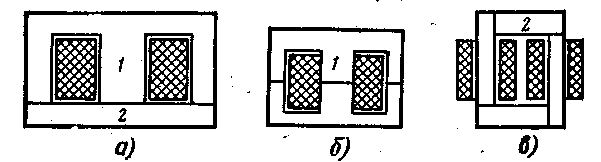 На рис. 2.2 приведены сердечники трансформаторов броневого — (а, б) и стержневого — (в) типов. Участки 1 сердечника, на которых размещены обмотки трансформаторов, называются стержнями, а участки 2, свободные от обмоток и соединяющие стержни в единую конструкцию, называются ярмами.