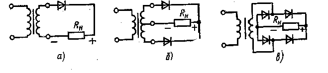В однофазной однополупериодной схеме (а) используется только часть мощности трансформатора, выпрямленное напряжение имеет большую переменную составляющую, к диоду приложено высокое обратное напряжение и, следовательно, выпрямитель обладает низким кпд.