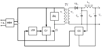Здесь обозначения функциональных узлов соответствуют: ФВФ — блок высокочастотных и низкочастотных фильтров и сетевой выпрямитель; TV -силовой трансформатор; S - силовой ключ, включаемый и выключаемый схемой управления СУ (сигнал