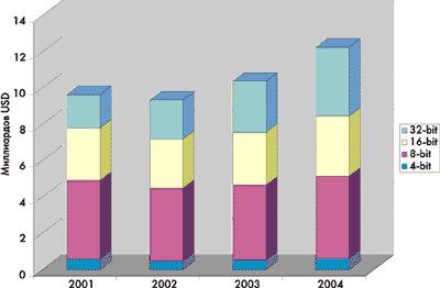 Рассмотрим подробнее 16- и 8-разрядные сегменты микроконтроллерного рынка. Мировые объемы выпуска 16-разрядных микроконтроллеров составляют на рынке 29% от его общей стоимости - $2,71 млрд. Темпы роста данного сегмента в 2002-2004 годах оцениваются на уровне не более 10%. При этом 50% общего количества выпускаемых 16-разрядных микроконтроллеров принадлежит именно Flash-микроконтроллерам. Из основных мировых лидеров здесь можно отметить Renesas (Hitachi + Mitsubishi), Infineon, Motorola и Texas Instruments. Эти четыре компании удерживают более 70% мирового рынка 16-разрядных микроконтроллеров (по данным IC Insight).