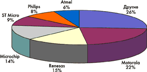 Но наиболее интересным представляется сегмент 8-разрядных микроконтроллеров. В 2002 и 2003 годах его стоимость составляла более $4 млрд. В каждом году этих микроконтроллеров производилось более 3,2 миллиардов штук. В данном сегменте 28% всего объема производства (в штуках) приходится на ОТР-микроконтроллеры, 45% - на масочные версии и 27% - на Flash-микроконтроллеры (34% всего сегмента по стоимости). При этом доля Flash-версий непрерывно растет и по оценкам независимых источников (Semico) составит к 2007 году до 64% общего количества выпускаемых в мире 8-разрядных микроконтроллеров. Средний прирост производства в этом сегменте планируется на уровне не менее 6-7% в год. Наиболее серьезными игроками на мировом рынке считаются Motorola (22%), Renesas (15%), Microchip (14%), ST Micro (9%) и Philips (8%) (рис. 3). Atmel находится здесь на почетном шестом месте с 6% долей рынка, одновременно лидируя в производстве именно Flash-микроконтроллеров. По итогам 2002 и 2003 годов доля Atmel составляет здесь 27%.