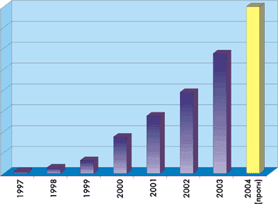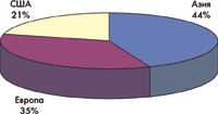 У корпорации Atmel также есть собственный хороший сегмент рынка 8-разрядных микроконтроллеров. Компания Microchip традиционно доминирует на "low-end" рынке для низкостоимостных приложений (разнообразные охранные системы и системы доступа), а компания Motorola несомненно занимает лидирующие позиции в 16- и 32-разрядных сегментах рынка и в автомобильном секторе приложений. В этом смысле Flash - микроконтроллеры с архитектурами AVR и С51 производства Atmel Corp. отлично вписываются в среднюю нишу, на стык между 8- и 16-разрядными микроконтроллерами, где в полной мере можно использовать все несомненные преимущества Flash-технологии. Особенно это касается, конечно, микроконтроллеров AVR. На рис. 4 показаны темпы роста объемов продаж AVR за семь лет развития этой платформы, а на рис. 5 - распределение объемов продаж AVR по регионам за 2003 год. Примечательно, что на долю Азии приходится уже 44% (в 2000 году было менее 4%!), на долю США - 21% и на долю Европы - 35% всего объема продаж. Это говорит о колоссальном успехе AVR на рынках, где традиционно доминировали NEC и OKI (Азия), Motorola и Microchip (США) и Philips / Siemens (Европа). Естественно, такими же темпами росло и производство кристаллов AVR. Только за последние три года Atmel открыла в Европе три новых фабрики по производству кремниевых пластин.