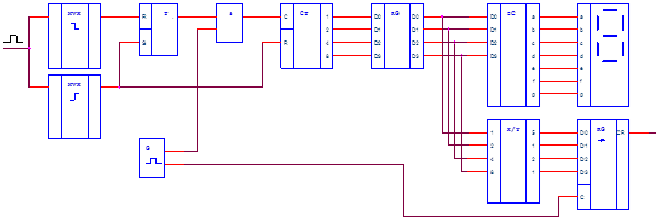 Схема отображения содержит регистр, дешифратор и индикаторы. Использование регистра позволяет избежать мерцания во время подсчета. Запись в регистр выполняется только по окончанию подсчета длительности импульса. Дешифратор необходим для преобразования двоично-десятичного кода в код обеспечивающий отображение соответствующей цифры.