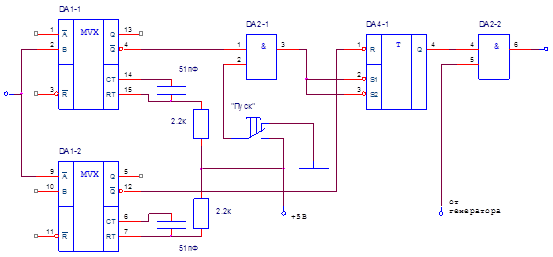 Детектор фронтов состоит из двух ждущих мультивибраторов и триггера. Один ждущий мультивибратор предназначен для выделения заднего фронта импульса и сбрасывает триггер. Другой ждущий мультивибратор предназначен для выделения переднего фронта импульса и переключает триггер в единичное состояние и вырабатывает сигнал сброса счетчика. Оба мультивибратора вырабатывают импульсы длительности необходимой для надежного переключения триггера.