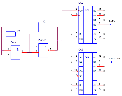 Для получения частот в 10000Гц и 1200Гц необходимо применить делители частоты. В качестве делителей удобно использовать счетчики К155ИЕ2 и К155ИЕ4. Для реализации деления на 5 используем счетчик К155ИЕ2 (DA3) подавая тактовые импульсы на вход C1 на выходе Q1 получим частоту деленную на 5. Для реализации деления на 6 используем счетчик К155ИЕ4.