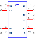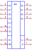 подается напряжение высокого уровня, разрешается работа тактового входа C2. В момент прихода на этот вход отрицательного перепада тактового импульса в регистр загружаются данные с параллельных входов D0-D3.