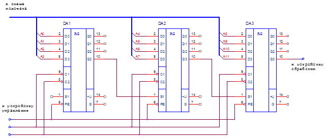 Для построения 12 разрядного регистра сдвига необходимо соединить 3 регистра последовательно, причем выход Q3 предыдущего регистра соединяется со входом S1 последующего.