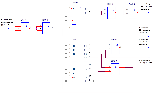 Схема подсчета тактовых импульсов состоит из элемента «И» и счетчика. Элемент «И» пропускает тактовые импульсы от генератора, только если триггер находится в единичном состоянии. Счетчик обеспечивает подсчет импульсов.