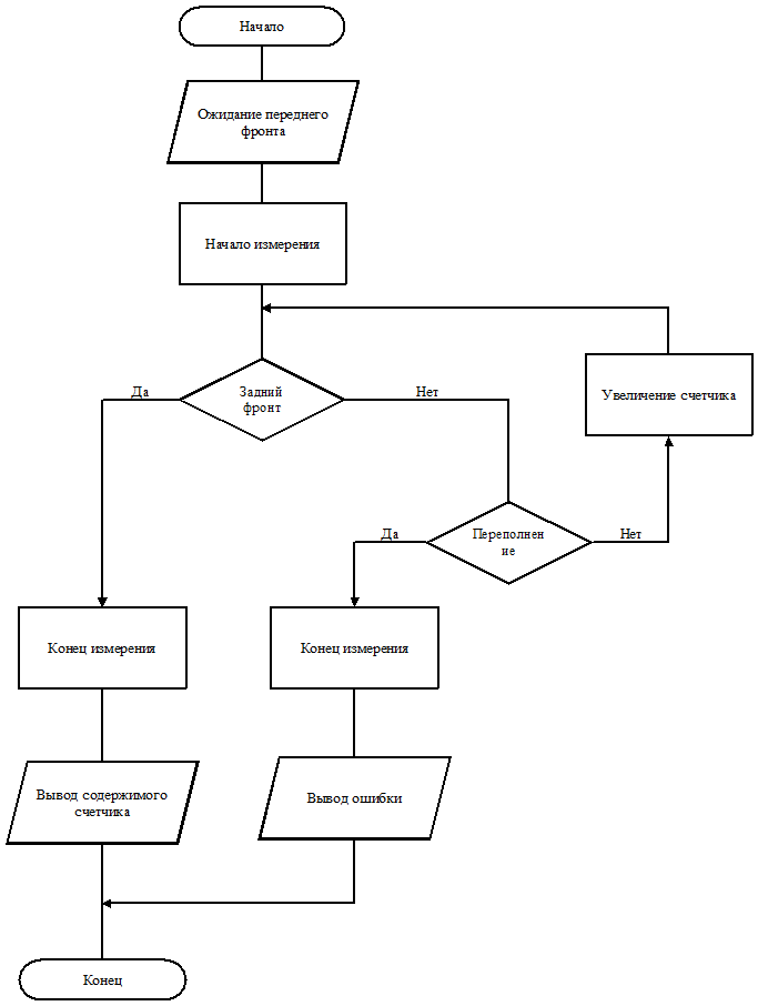 Работу устройства можно представить следующим образом. По переднему фронту импульса начинается отсчет. При поступлении заднего фронта импульса или при превышении заданного интервала времени отсчет останавливается. Если значение в счетчике превышает заданный предел, на панели отображения выводится сигнал «ошибка». В противном случае на панели отображения отображается содержимое счетчика и величина измеренного интервала передается в устройство обработки. Описанный алгоритм отображен в приложении 1.