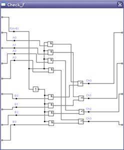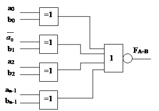 Многоразрядный компаратор на равенство состоит из элементов ИСКЛ. ИЛИ для поразрядного сравнения (рисунок 7).