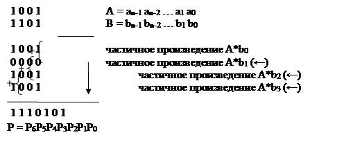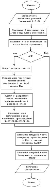 Наиболее высокое быстродействие достигается в матричных умножителях, в которых все частичные произведения образуются одновременно на разных блоках конъюнкторов, совмещены во времени, но разделены в пространстве, произведение сразу же образуется с помощью набора из (n-1) сумматоров (n – разрядность чисел), причем сдвиг в разрядной сетке частичных произведений выполняется монтажным способом. Составим блок-схему алгоритма работы УА.