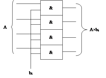 Процедура ручного умножения множимого A = an -1 an -2 … a1 a0 на множитель B = bn -1 bn -2 … b1 b0 заключатся в образовании частных произведений множимого A на разряды множителя B, при этом частичные произведения располагаются в разрядной сетке всякий раз со сдвигом на 1 разряд влево. Далее частичные произведения складываются для получения произведения P = P2 n -1 …P1 P0 . Результатом умножения множимого на разряд множителя bi равен 0 в случае bi = 0 или самому множимому A в случае, когда bi = 1, следовательно, для умножения A×bi можно использовать блок конъюнкторов (рисунок 8):