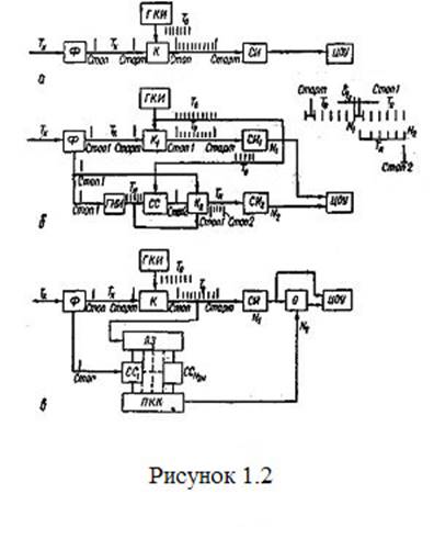 Интервал времени Тх измеряется цифровым хронометром (рисунок 1.2 а) путем сравнения с интервалом NT0 . Для снижения погрешности необходимо уменьшение Т0 , т. е. повышение скорости счета импульсов счетчиком. Максимальная скорость прямого счета счетчиками импульсов достигает 109 имп/сек, однако у большинства серийных счетчиков импульсов не превышает 107 имп/сек.