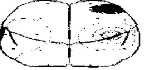 На рис. 8 наведена ЕЕГ хворої з пухлиною довгастого мозку. Фазовий аналіз ЕЕГ потиличної області показує відсутність самостійної та модулюючої альфа-періодики. Звертає на себе увагу домінування повільної активності.