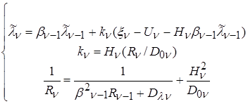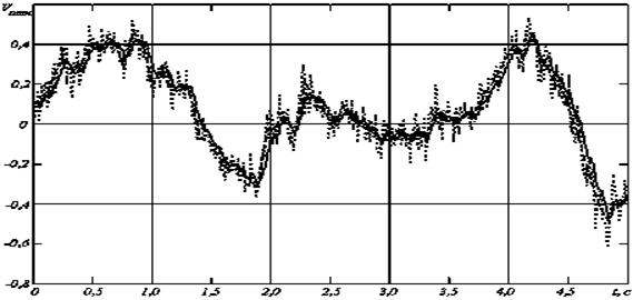 Ця система розв'язується чисельно за допомогою алгоритму, що дозволяє знайти часову залежність процесу за умови мінімуму вихідної дисперсії. На рис. 2 наведені часові залежності ЕЕГ(пунктир) і ЕЕГ, обробленої фільтром Калмана (суцільна).
