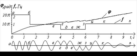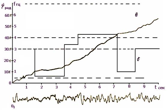 Для ілюстрації можливостей методу фазочастотного аналізу на рис. 4 показані відрізки штучно складених реалізацій і відповідні цим реалізаціям фазові і частотні криві. Реалізація, зображена на рис. 4, складена з відрізків синусоїд з різними амплітудами і частотами. З рисунка видно, що фазові залежності в межах синусоїдальних відрізків являють собою прямі лінії, що відповідають коливанням з постійною частотою. Стрибки фаз у коливальному процесі знаходять чітке відображення на фазовій кривій. Відрізкам синусоїд з однаковою частотою, але різними амплітудами відповідає той самий нахил фазової кривої, тобто та сама частота коливань.