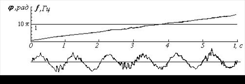 Реалізація, показана на рис. 5, отримана шляхом довільного перекручування (модуляції) форми синусоїди накладенням більш високочастотного коливання невеликої амплітуди. Як видно з фазової кривої, наявність високочастотних низькоамплітудних коливань, що модулюють, приводить до перекручування форми фазової кривої та її відхилення від прямої лінії. Однак частота, отримана шляхом згладжування цієї кривої, дорівнює частоті неспотвореної синусоїди. Отже, на фазовій кривій можна виділити частоту високоамплітудного коливання.