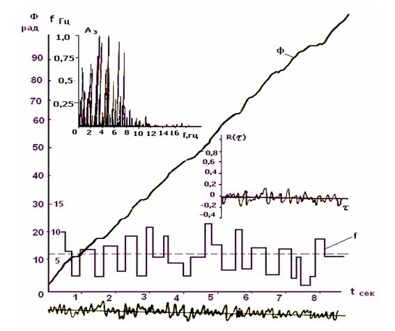 – амплітудний спектр і автокореляційна функція відповідно). Форма фазової кривої в цьому випадку складна, визначити по ній частотні характеристики процесу можна двома способами. По-перше, згладивши криву в межах відрізків часу