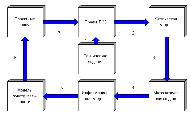 Путем сопоставления требований ТЗ с расчетными характеристиками, режимов работы элементов с допустимыми режимами, приведенными в технических условиях (стрелка 5) выявляются те характеристики и режимы работы элементов которые необходимо изменить и на этой основе строится модель чувствительности.