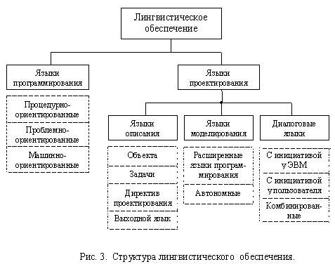 рис.4 Структура лингвистического обеспечения Языки, используемые в САПР (рис.4), можно разбить на две основные группы: языки программирования и языки проектирования . Языки программирования предназначены для написания текстов программ. При этом процедурно-ориентированные языки (Фортран, ПЛ1, Паскаль, АДА, Си) предназначены для широкого класса задач. Машинно-ориентированные языки (Ассемблер) позволяют создавать программы, наиболее эффективные в смысле использования ресурсов памяти, времени счета и т.д. Выбор языка определяется поставленной задачей, например, требуется разработать программу в предельно короткие сроки; программу, которая была бы наиболее эффективной с точки зрения вычислительных затрат (затрат времени, памяти) или программу, максимально мобильную, т.е. пригодную для работы на любом компьютере. Таким образом, при выборе языка необходимо учитывать, каким требованиям должна удовлетворять программа. Основные соображения при выборе языка , которых нужно придерживаться, следующие. Если главное – скорость написания, то программу следует писать на языках высокого уровня – процедурно – или проблемно-ориентированных. Если основным требованием является эффективность программы, то используется язык низкого уровня - Ассемблер. Машинно-ориентированные языки используют также в случае, если основным требованием выступает мобильность. При написании сложных программ возможен компромисс. Перечисленные выше языки программирования не пригодны для описания объектов и задач проектирования, т.к. в них отсутствует такие понятия, как "тип объекта", "связи объекта", "параметры объекта", нет описания типовых процедур проектирования. Для этого созданы предметно-ориентированные языки. Они называются входными языками или просто языками проектирования. |