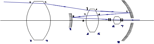 Нумерация элементов оптической системы ведется по ходу луча (рис.3). Все расстояния между поверхностями (толщины линз или воздушные промежутки) откладываются по оси.