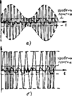 Сравним соотношение между сигналом и помехой на входе приемника при частотной модуляции и при амплитудной модуляции. Положим, что амплитуда частотно-модулированного сигнала равна амплитуде амплитудно-модулированного (АМ) сигнала в момент ее наибольшего значения (фиг. слева) Интенсивность воздействия помехи на входе приемника в обоих случаях считаем одинаковой. Как видно из рисунка а), соотношения между сигналом и помехой при АМ колебаниях беспрерывно изменяются. При больших амплитудах сигнал значительно превышает помеху и ее влияние на прием незначительно, и, наоборот, при малых амплитудах, сигнал может быть на уровне помехи, и в этом случае помеха будет препятствовать нормальному приему. Следовательно, для обеспечения достаточной помехоустойчивости приемника при АМ колебаниях необходимо, чтобы минимальная амплитуда полезного сигнала превышала уровень помехи в достаточное число раз. Совершенно иное положение наблюдается при приеме ЧМ колебаний. Из рисунка б) видно, что соотношение между сигналом и помехой остается неизменным и по величине сохраняется таким же как в случае амплитудной модуляции в момент ее наибольшей