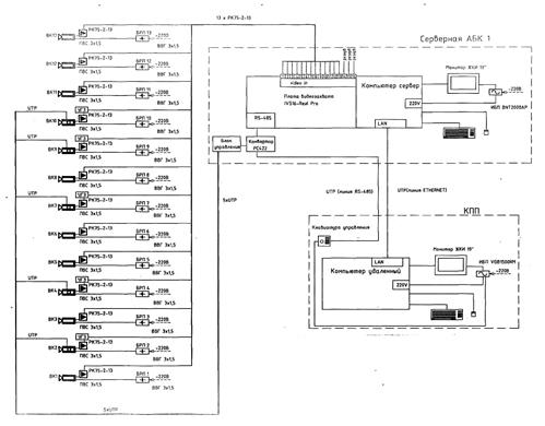 Управление поворотными ВК осуществляется по кабелю UTP, а передача видеосигнала к серверу - по кабелю РК75.