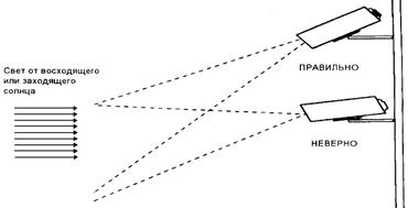 В любом случае при наблюдении за открытым участком местности обязательно должен быть исключен из поля зрения камеры прямой и отраженный солнечный свет, что демонстрируется на рис. 4. При открытом горизонте должно быть также вычислено наиболее низкое расположение солнца в зимние месяцы. В этом случае часто подходящим решением является выбор более высокого места монтажа камеры.